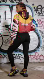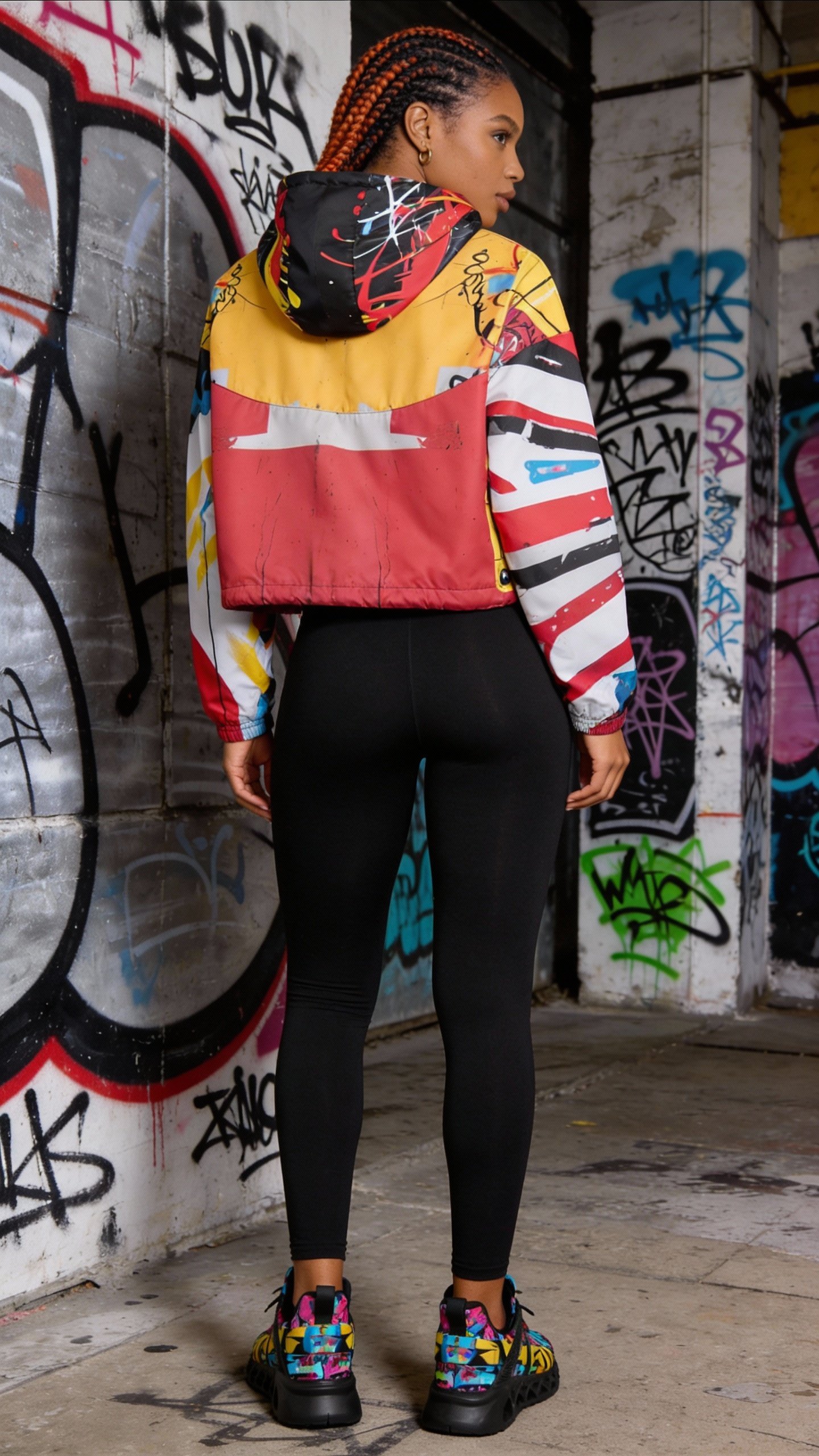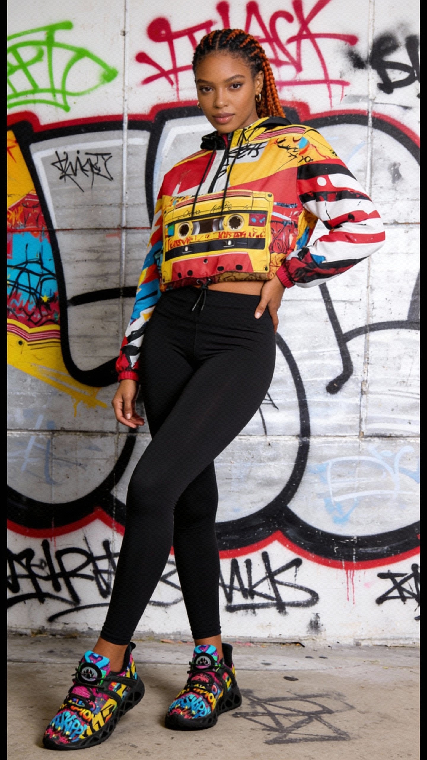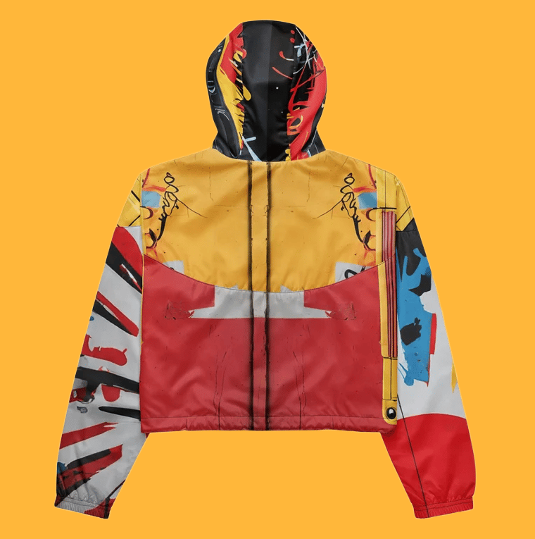 Cassette cropped windbreaker spins retro vibes with modern street style. Splashed in bold yellow, red, and black tones, it features graffiti-inspired art that pulses with urban energy. Front and center, a classic 80s cassette graphic turns heads, channeling old-school cool with a fresh, wearable edge. Lightweight and statement-making, it’s perfect for anyone ready to rewind the style clock while keeping their look sharp and unstoppable.
