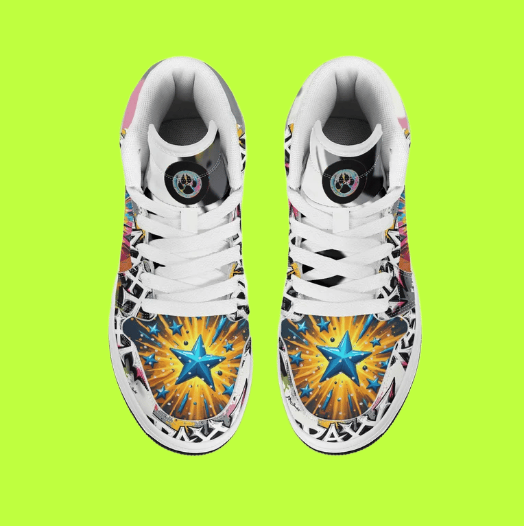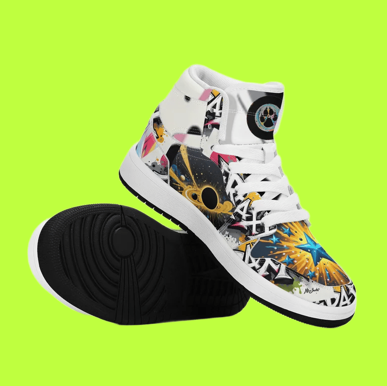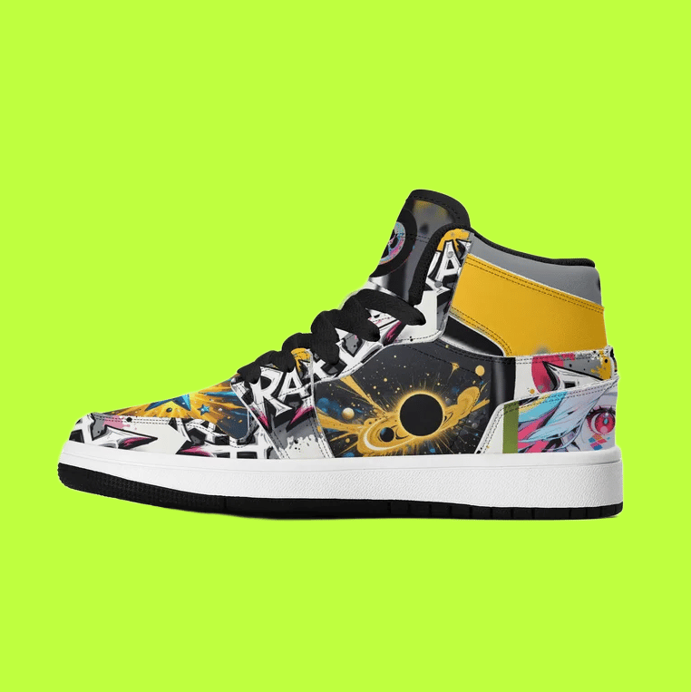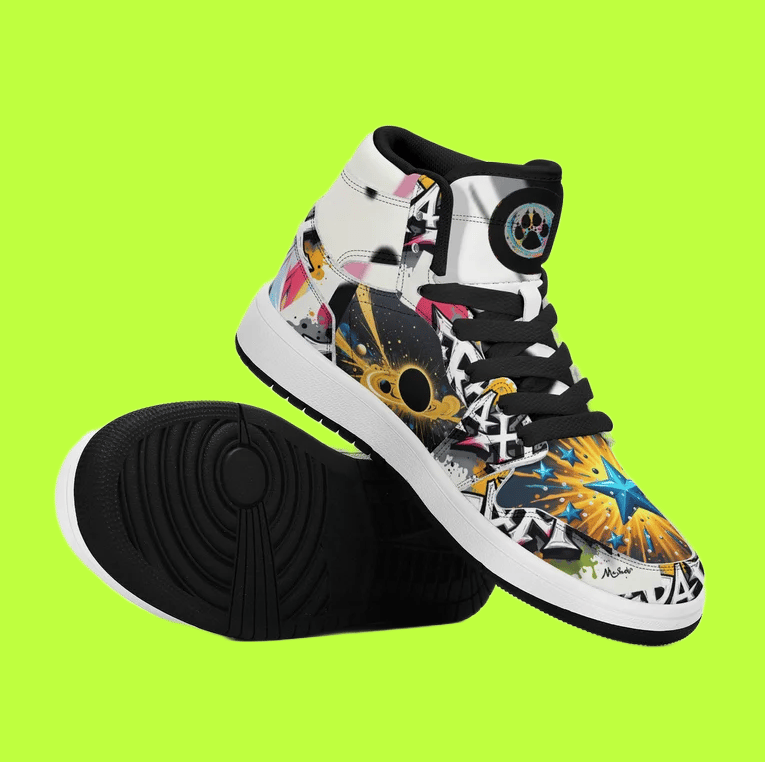 Out Of This World high tops launch street style into the cosmos, blending bold graffiti motifs with swirling galaxy artwork. Bright, electric colors burst against a deep black background, creating a cosmic canvas that’s both edgy and vibrant. Designed for kids who dream big and move fast, these sneakers bring the stars down to street level—turning every step into an interstellar adventure with a dash of urban attitude.