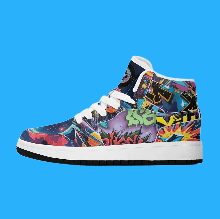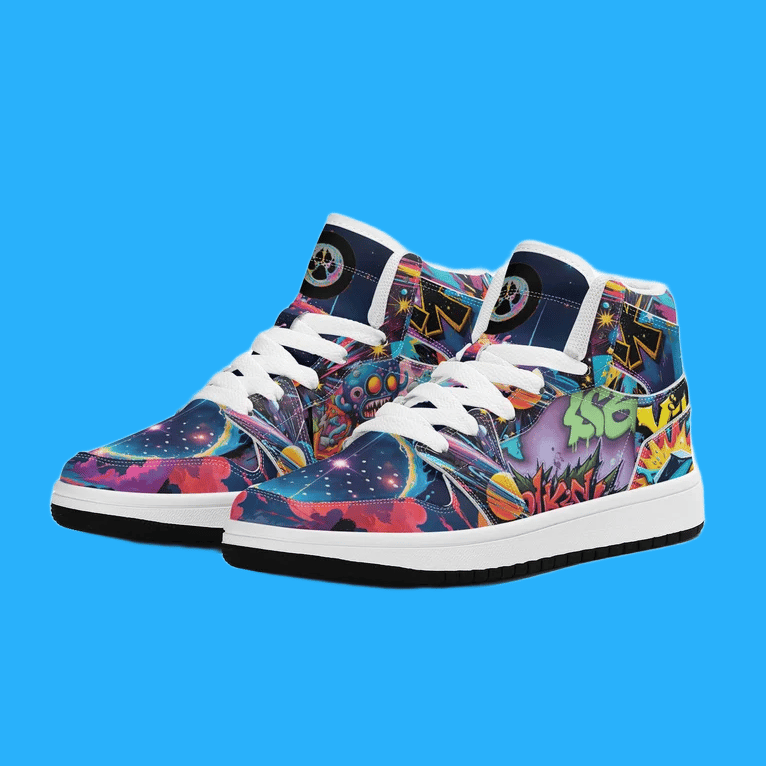 Pluto high tops burst with playful street style, covered in bright, colorful tones and bold graffiti graphics. Bursts of neon, splashes of paint, and edgy street art patterns turn these sneakers into a wearable canvas of creativity. Designed for kids with big personalities and endless energy, they bring urban flair to every step. Fun, vibrant, and full of attitude—Pluto makes the sidewalk feel like their own personal playground.