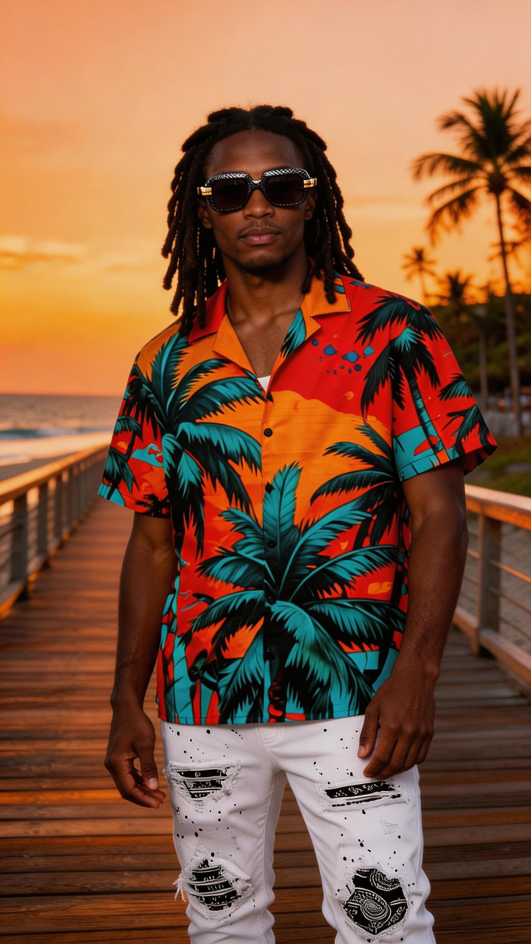 Turn up the heat in the Rico Suave — a bold tropical button-down that screams vacation vibes. Featuring a vibrant red, orange, and teal palm tree print against a fiery sunset backdrop, this shirt delivers effortless island swagger.