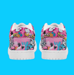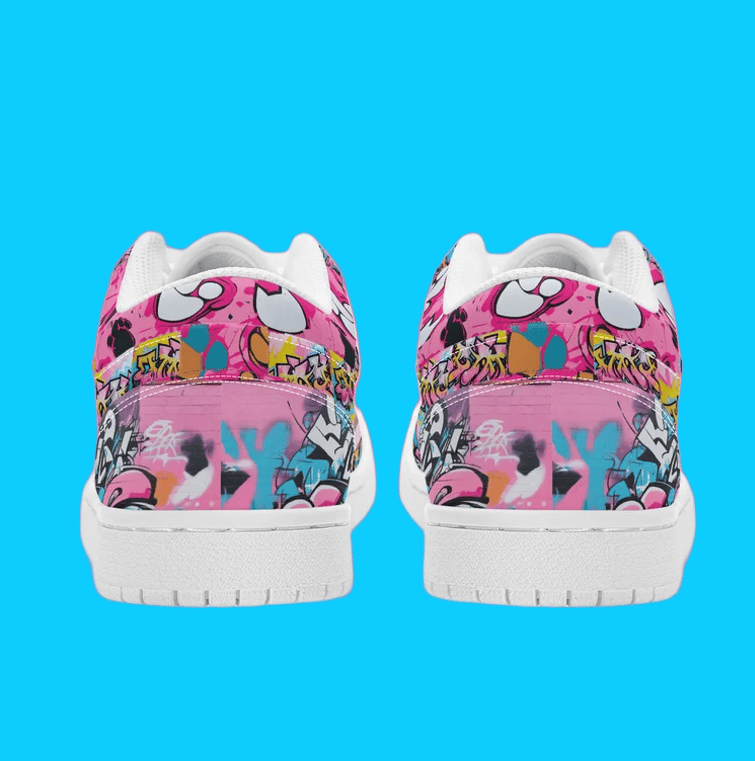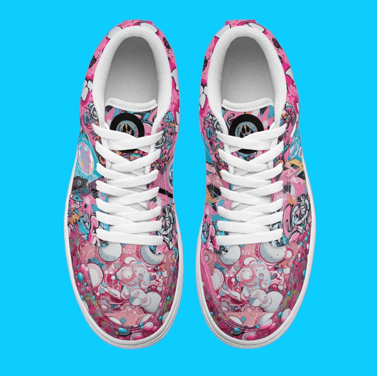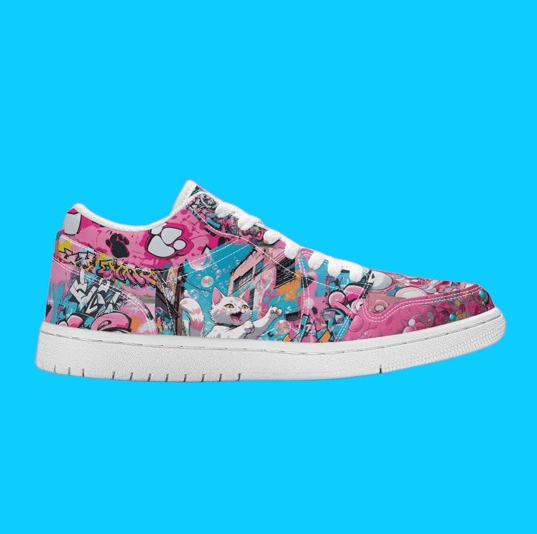 Tyra Katz low tops pop with vibrant street style, splashed in soft light blue and pink tones. An anime-style cat, wide-eyed and full of mischief, chases shimmering bubbles down a lively city street. Bright colors and playful details capture a perfect blend of urban energy and whimsical charm, making every step feel like part of a dreamy, animated adventure. Bold, fun, and irresistibly cute—these sneakers are pure city magic.