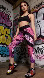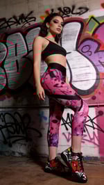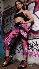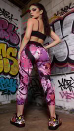 Introducing Neon Drip by Doc Skippy: vibrant yoga capri leggings featuring a dynamic spray-paint graffiti pattern. Bold strokes of white, black, purple, lilac, and pink blend seamlessly for an edgy, artistic vibe.